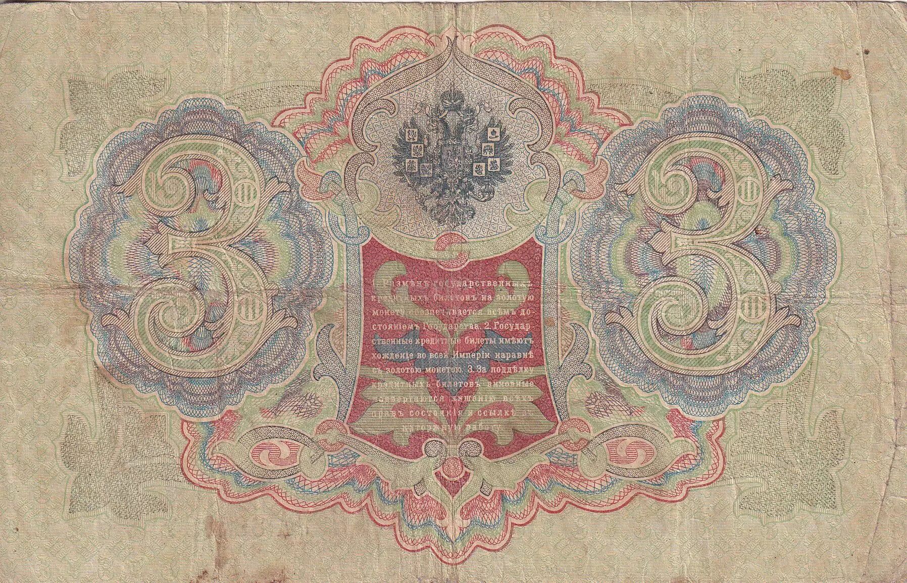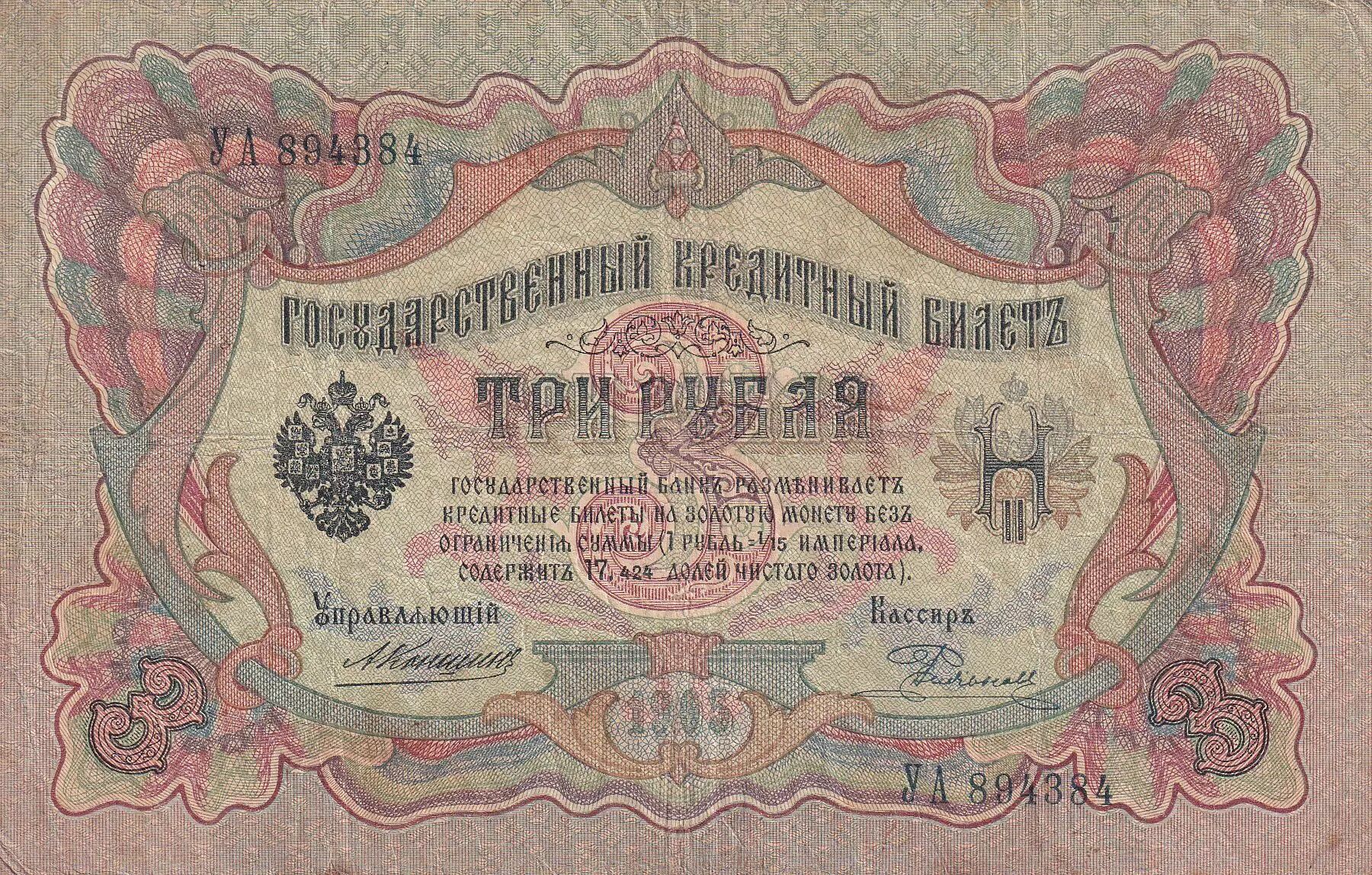 Accueil > Archivage > Russie 3 Roubles - Vert et rose - Sign. Konshin (1909-1912) - P.9c