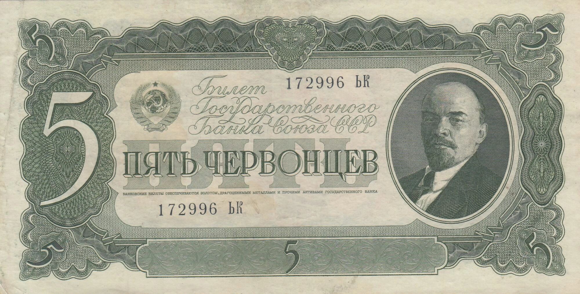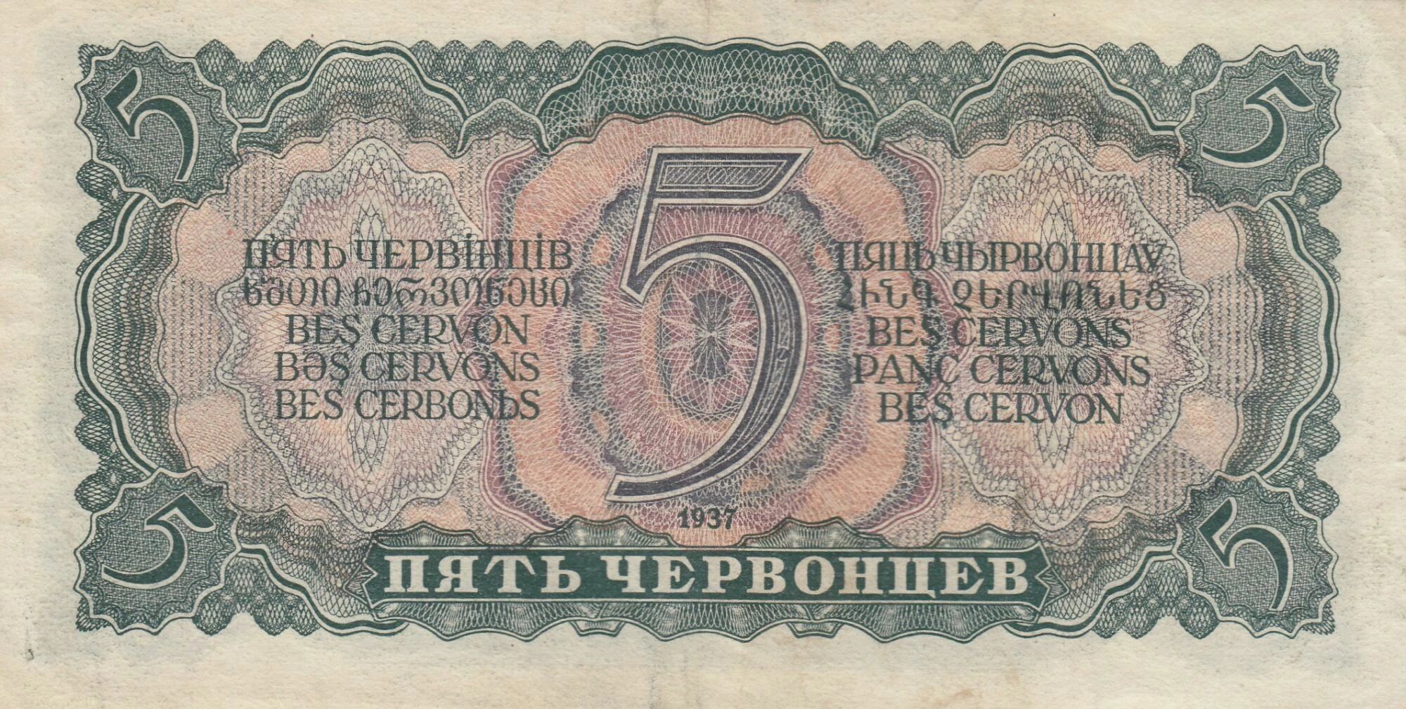 Le billet de 5 chervontsev émis en 1937, référencé P.204, est un spécimen de la période de l'Union des Républiques Socialistes Soviétiques (URSS), plus précisément de la Russie. Ce billet entre dans la catégorie des billets courants utilisés durant cette ère.