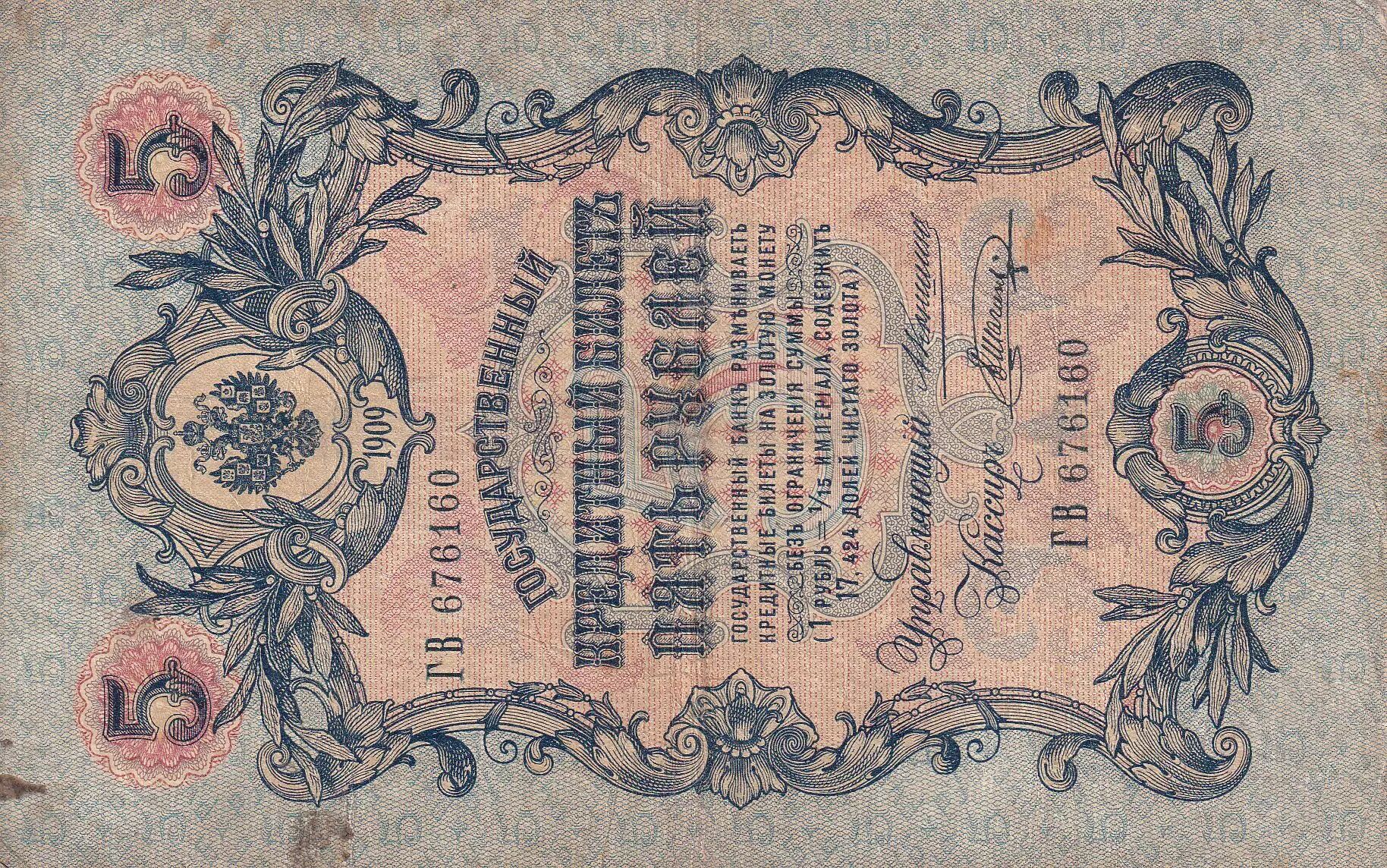 Billet Russie 5 Roubles - Aigle impérial - 1909 - Sign. Konshin (1909-1919) - P.10a