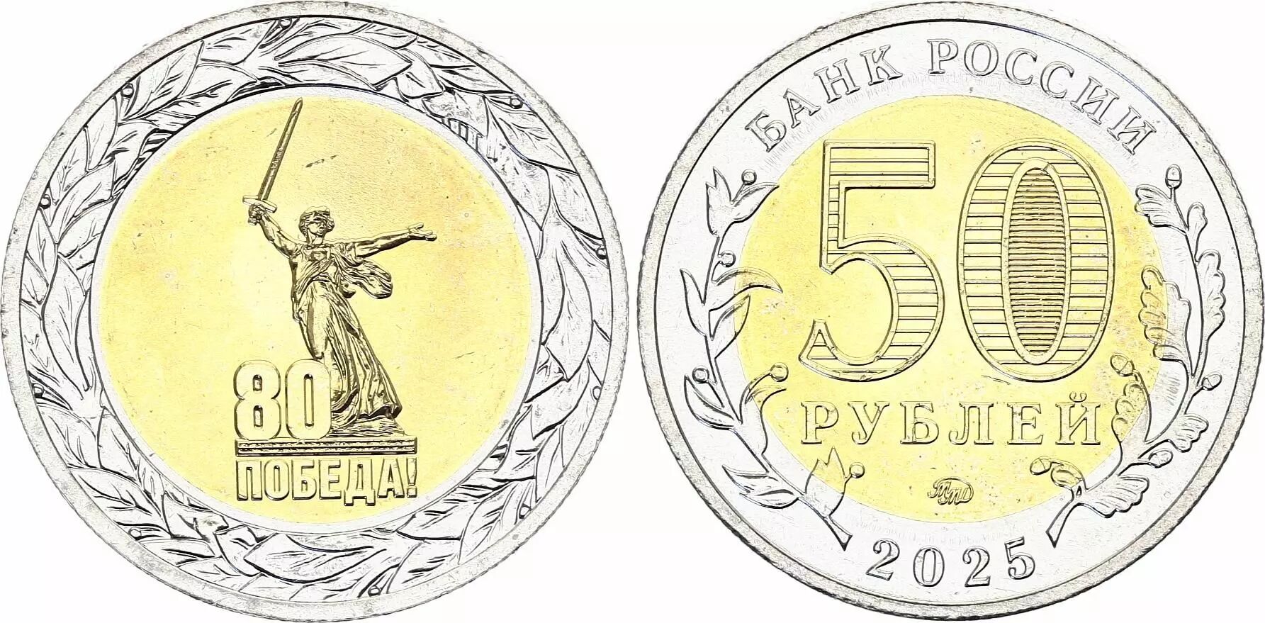 Cette pièce commémorative de Russie est frappée avec une valeur faciale de 50 roubles. Elle est émise en 2025 pour marquer le 80e anniversaire de la Victoire du Peuple Soviétique.