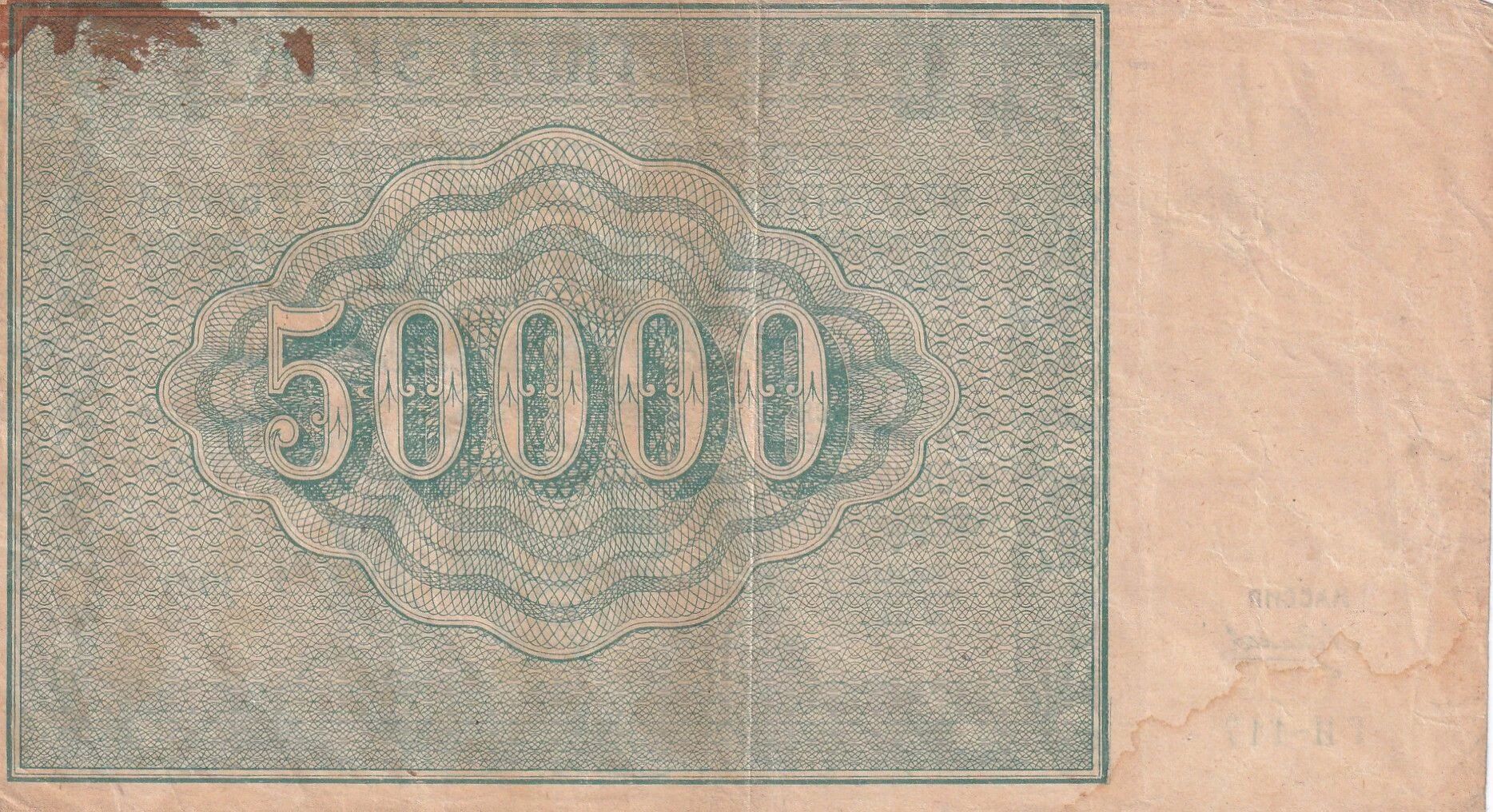 Ce billet de banque a été émis en Russie et présente une valeur nominale de 50000 roubles. L'année d'émission est 1921.