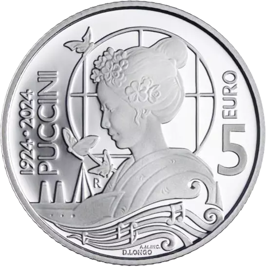 Saint-Marin célèbre le 100e anniversaire de la mort de l'artiste, survenue le 29 novembre 1924 en Belgique, avec une pièce représentant la protagoniste de l'un de ses opéras les plus célèbres : Madama Butterfly. L'avers représente les armoiries de la République de Saint-Marin (A. Napolione) tandis que le revers montre, au centre, un portrait de Madama Butterfly, le personnage pincipale de l'opéra du même nom, trois papillons en vol, un bateau à gauche et une partition musicale en bas. La pièce est complétée par les dates « 1924-2024 ? et la légende ? PUCCINI ?, au centre la lettre R, identifiant la Monnaie de Rome, à droite la valeur 5 EURO, en bas au centre le nom de l'auteur D.LONGO et les initiales d'Annalisa Masini, qui a supervisé la gravure, A.M.INC.