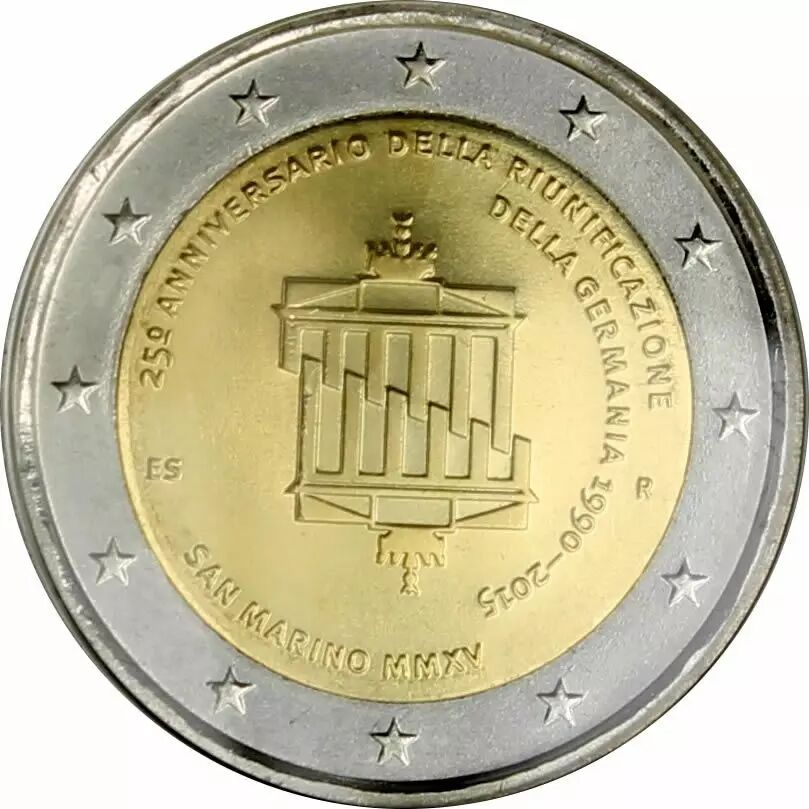 Saint-Marin célèbre le 25e anniversaire de la réunification de l'Allemagne avec une pièce de 2 ? commémorative conçue par Erik Spiekermann designer allemand de renommée internationale créateur de caractères typographiques professeur à l'Université des Arts de Brême.