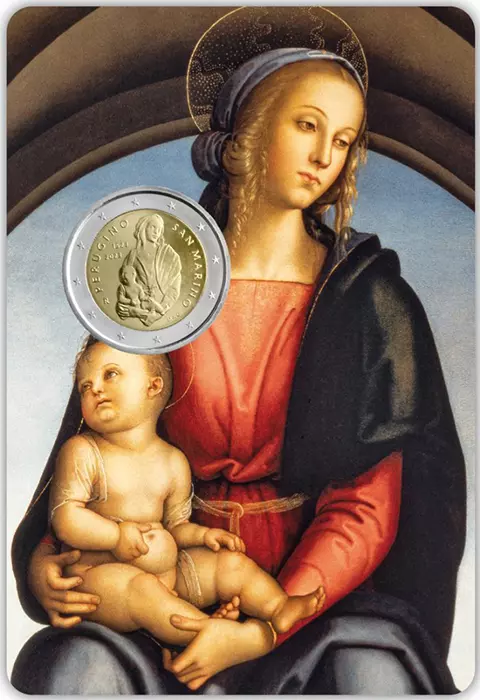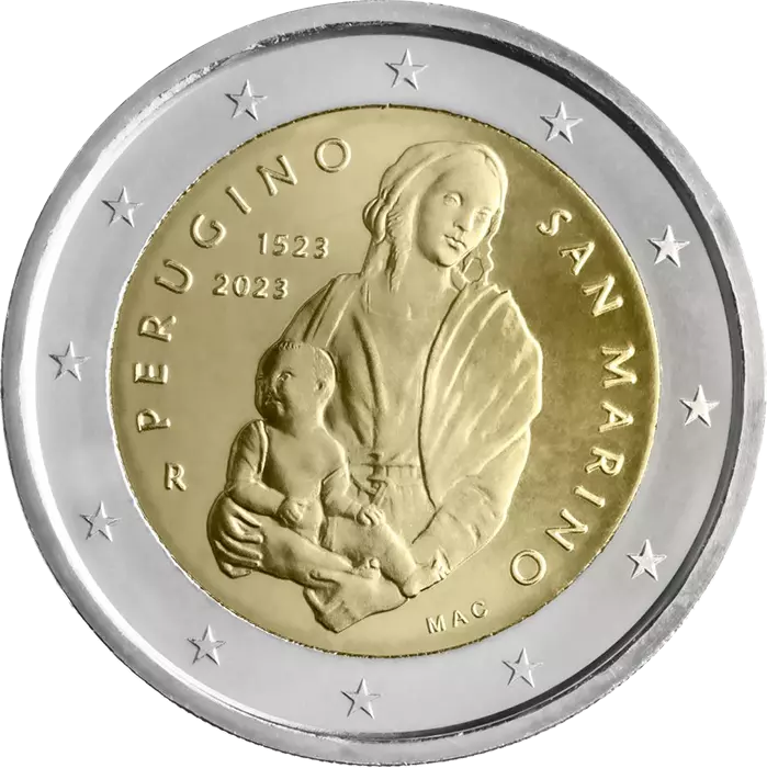 Le motif principal de l'avers est un détail de la peinture "Vierge à l'Enfant Saint Sébastien et Saint Jean Baptiste" du Pérugin, ?uvre conservée à la Galerie des Offices de Florence. On y voit la Vierge Marie tenant l'Enfant Jésus. L'inscription "PERUGINO" figure sur la pièce, accompagnée des dates "1523" et "2023". La lettre "R", identifiant la Monnaie de Rome, est également présente sur la gauche. À droite, on trouve l'inscription "SAN MARINO" ainsi que les initiales "MAC" de l'auteur, Maria Angela Cassol. Les douze étoiles de l'Union européenne sont disposées autour du motif central.