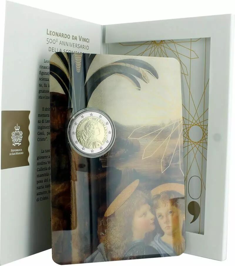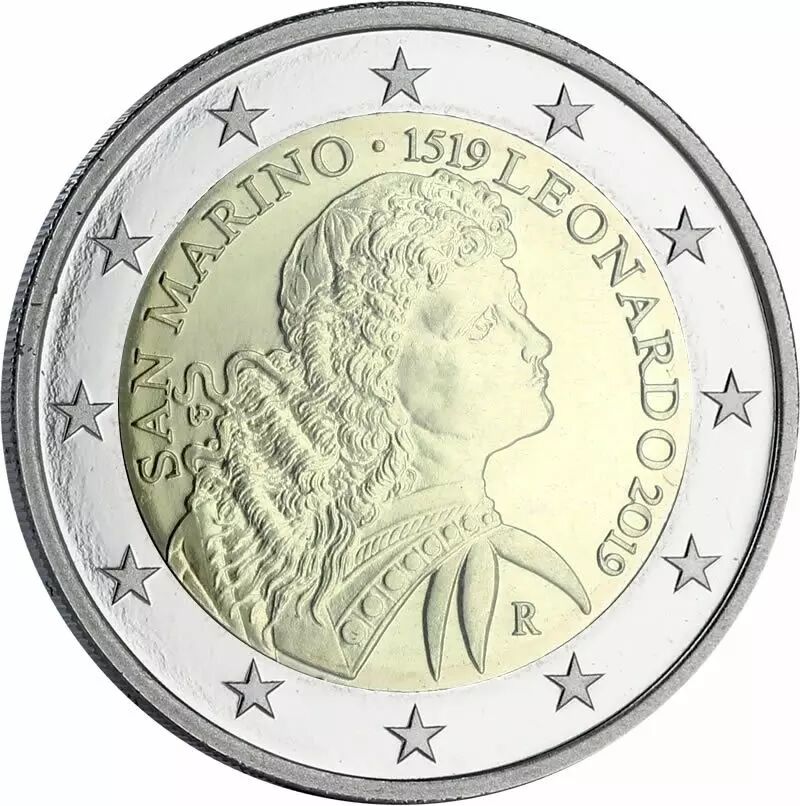 Cette pièce commémorative de 2 euros a été émise par Saint-Marin en 2019 pour marquer le 500e anniversaire de la mort de Léonard de Vinci.