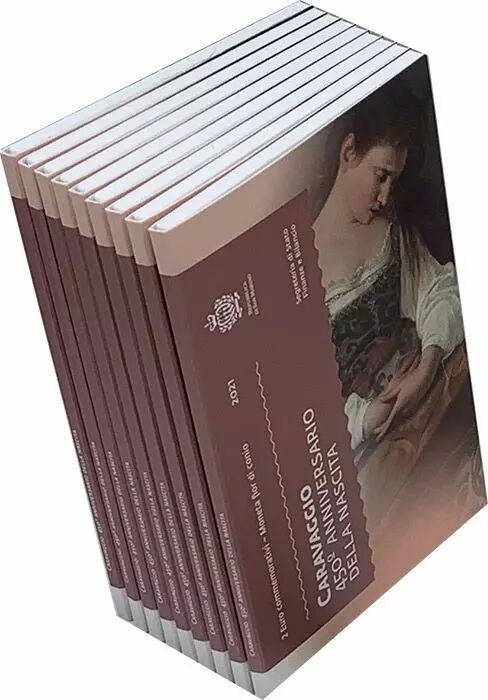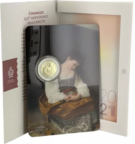 Cette pièce commémorative de 2 euros, frappée par Saint-Marin en 2021, rend hommage au 450e anniversaire de la naissance du Caravage, Michelangelo Merisi. Elle est présentée sous blister officiel.