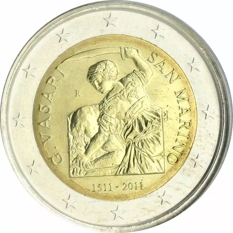 Cette pièce commémorative de 2 euros a été émise par Saint-Marin en 2011. Elle célèbre le 500e anniversaire de la naissance de Giorgio Vasari.
