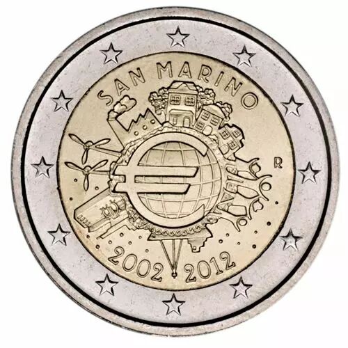 Cette pièce commémorative de 2 euros a été émise par Saint-Marin en 2012 pour célébrer le 10e anniversaire de l'introduction de l'euro. Elle fait partie des pièces commémoratives émises par les pays de la zone euro pour marquer cet événement.