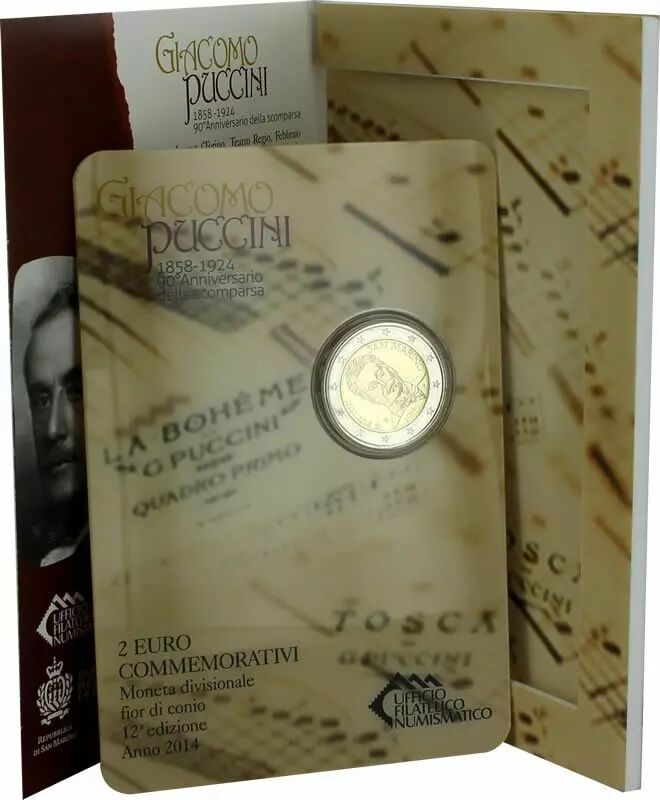 La pièce montre le portrait du musicien et compositeur italien Giacomo Puccini (né le 22 Décembre 1858 à Lucca mort le 29 Novembre 1924 à Bruxelles). Sur le bord gauche son nom et la marque d'atelier R (Rome) et en dessous l'année.