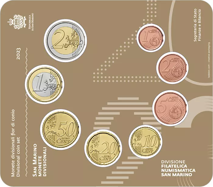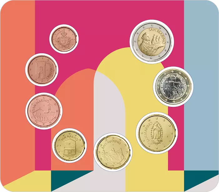 En 2017 San Marin a changé l'ensemble de ses visuels nationaux sur les pièces en euros que le pays émet. La 2 euros représente un détail du tableau de Urbinelli avec Saint Marin portant les trois Tours" de la petite république. La 1 euro est illustré par le chateau de Cesta souvent appelé la Seconde Tour. La pièce de 50 est ornée du portrait de Saint Marin d'après Restrosi. Sur celle de 20 centimes on retrouve les trois Tours du Mont Titano symbole de San Marin. La façade de l'Eglise San Francisco est représentée sur la pièce de 10 centimes et celle de San Quirino sur celle de 5 centimes. La pièce de 2 centimes est illustrée par la porte de la ville alors que la pièce de 1 centime a les armoiries de Saint Marin comme illustration .