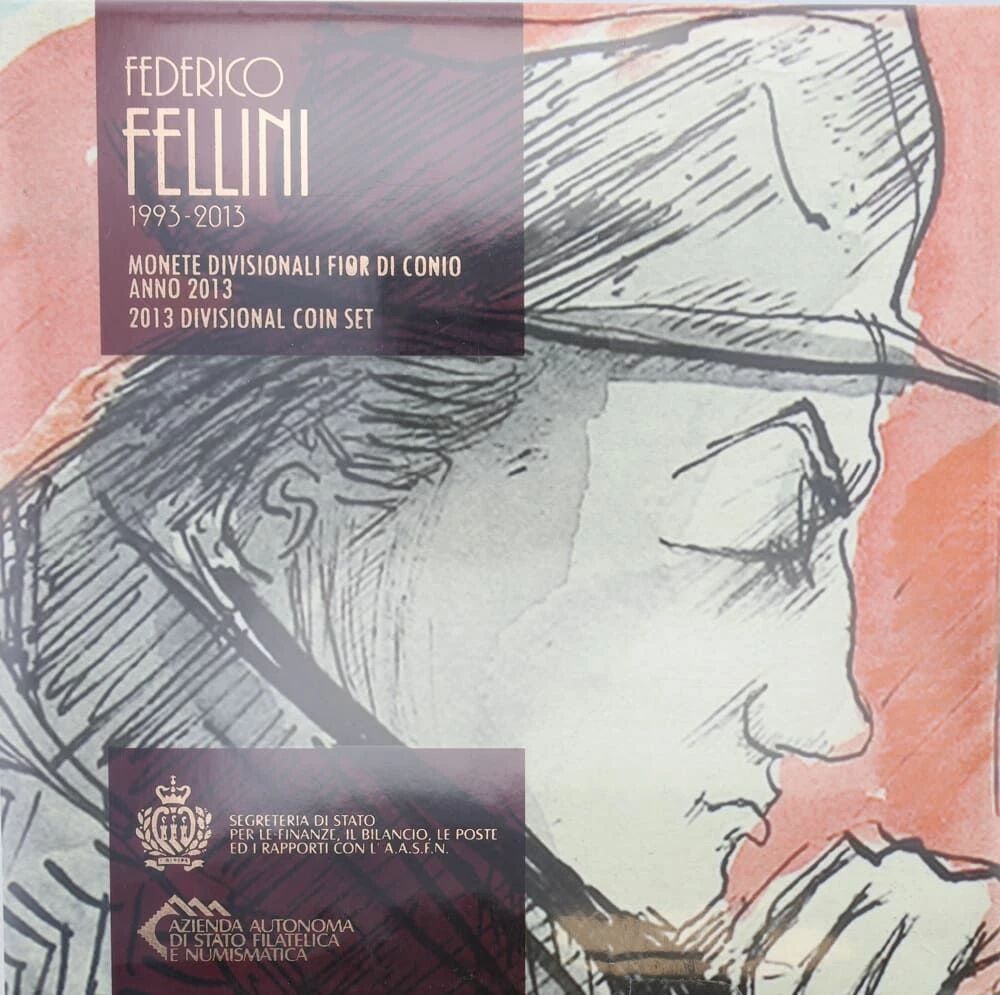 Ce coffret numismatique, émis par la République de Saint-Marin en 2013, commémore le 20e anniversaire de la disparition de Federico Fellini, réalisateur italien de renom. L'ensemble comprend un total de neuf pièces.