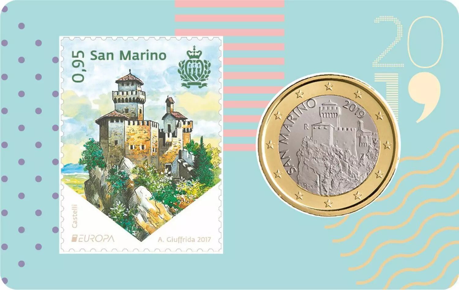 Le premier coincard timbre et pièce comprend un timbre de 0,95 ? de la série postale Europa Castelli 2017 avec une représentation de la deuxième tour et la pièce de 1,00 ? avec l'année 2019.