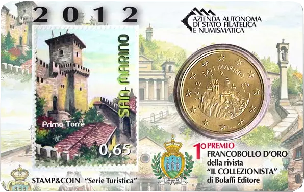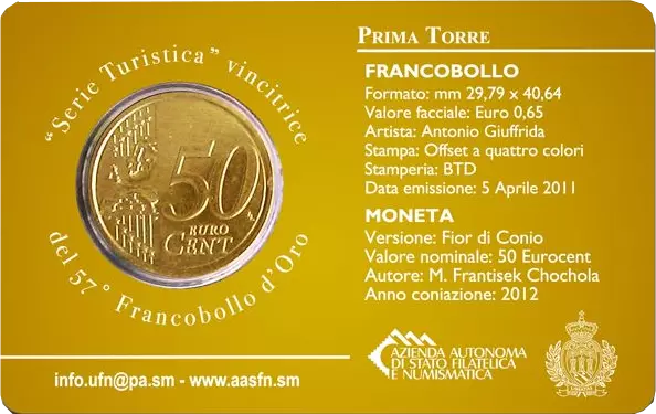 Ce coincard (85,55 mm x 54mm) associe de manière emblématique le timbre célébrant les beautés architecturales de Saint-Marin (par l'auteur Antonio Giuffrida), gagnant de la 57ème édition du concours philatélique organisé par le magazine « Il Collezionista », avec la pièce de 50 centimes de la série divisionnaire 2012 Brilliant Uncirculated, par le designer Frantisek Chochola.