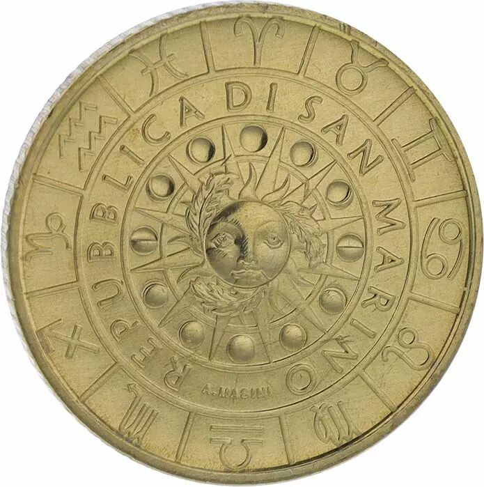 Sur l'avers au milieu de la pièce est représenté un soleil délimité par la représentation des phases lunaires. Autour du soleil gravitent trois plumes symbolisant la République de Saint-Marin. Sur le contour on retrouve la représentation des douze signes du zodiaque.