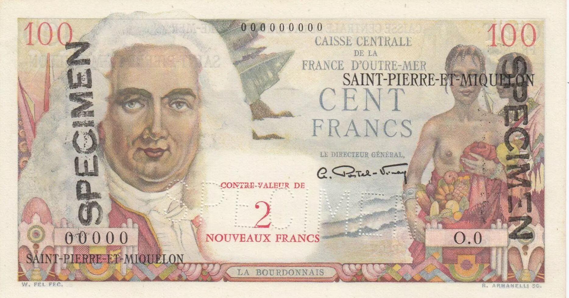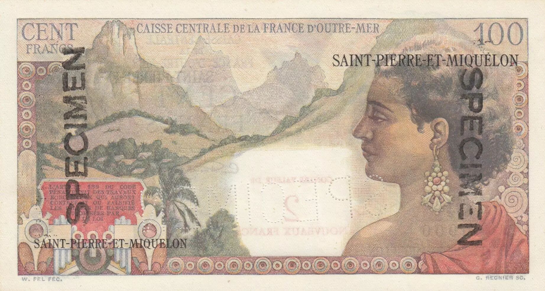 Home > > Saint Pierre & Miquelon 2 NF / 100 Francs - La Bourdonnais - ND (1946) - Specimen