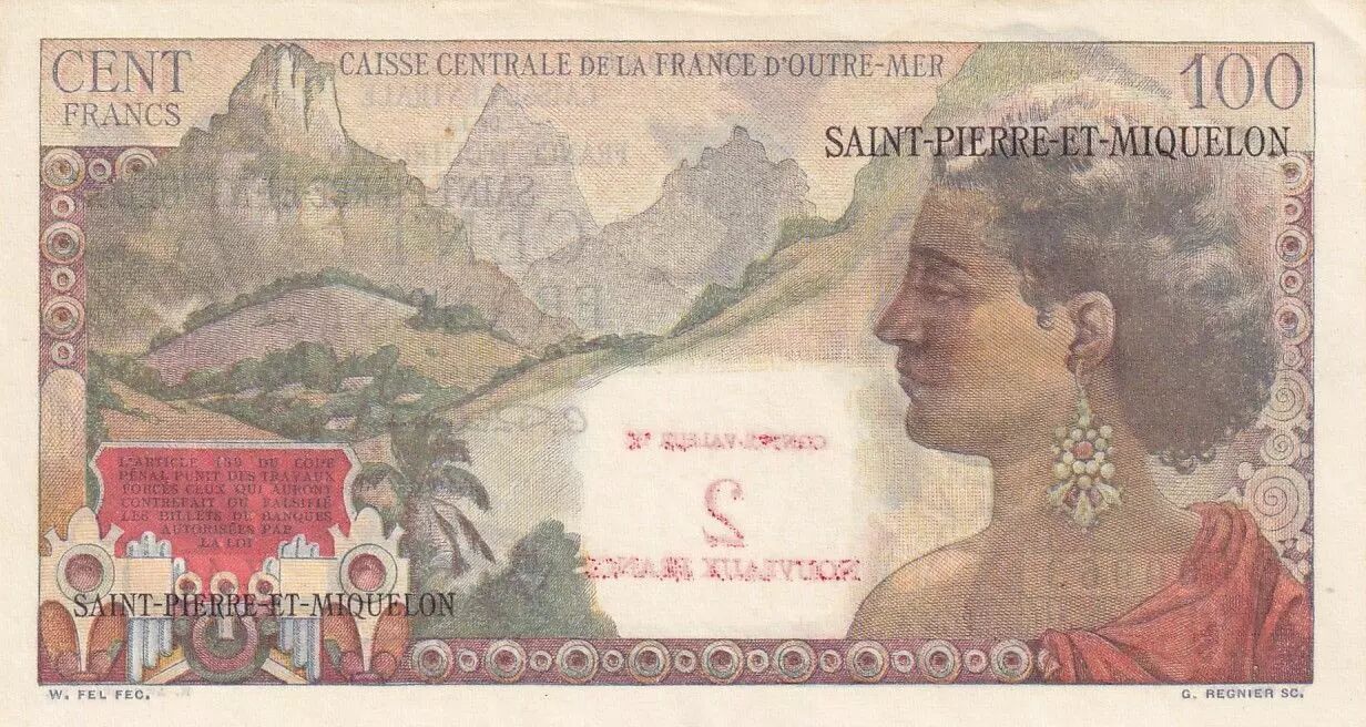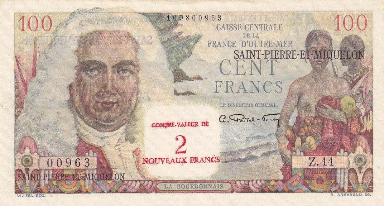 On the front, the banknote features a portrait of Bertrand François Mahé de La Bourdonnais (1699-1753), a French naval officer and colonial administrator who served the French East India Company. There is also a representation of two indigenous women. The Latin inscriptions mention the Caisse Centrale de la France d'Outre-Mer, the value of 100 francs, the counter-value of 2 new francs, as well as the place of issue, Saint-Pierre and Miquelon. The names of the artists involved in the design of the banknote are also indicated: W. Fel. Fec. and R. Armanelli Sc., respectively designer and engraver.