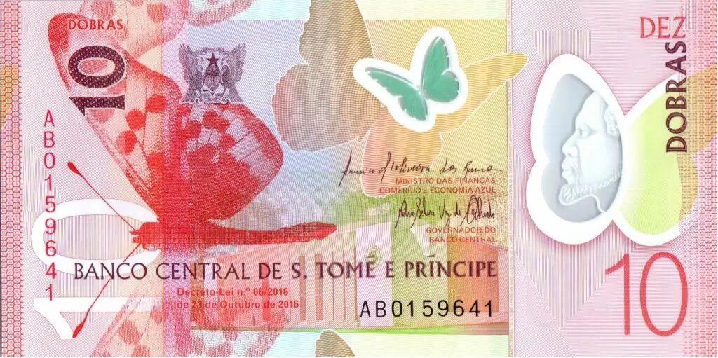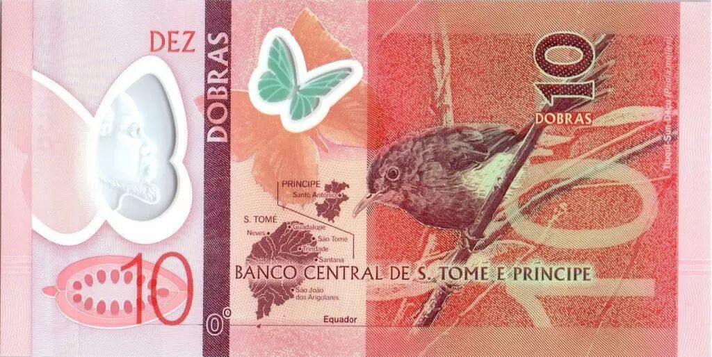 Home > World Banknotes > African Banknotes > São Tomé and Príncipe > Saint Thomas and Prince 10 Dobras - Butterfly - Bird- Polymer - 21-10-2016 - Serial AB