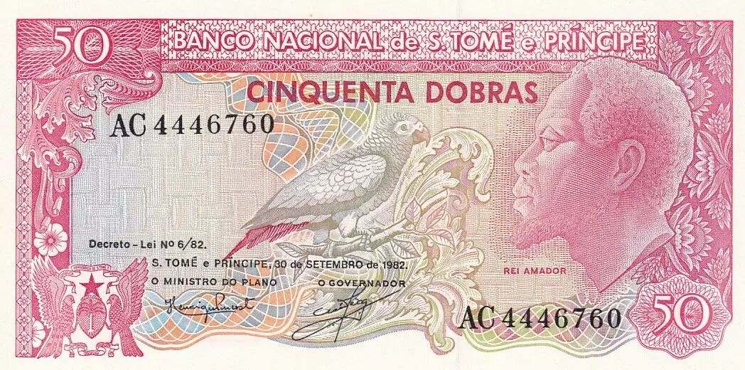 This 50 dobras banknote, issued by Sao Tome and Principe in 1982, features distinct visual characteristics on both sides.