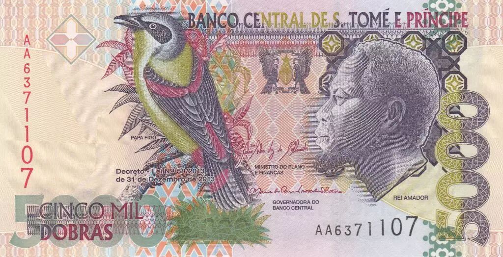 Banknote Saint Thomas and Prince 5000 Dobras King Amador, bird - Esplanade - 2013