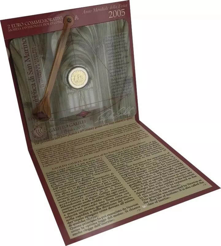 This 2 euro commemorative coin, issued by San Marino in 2005, celebrates the World Year of Physics. The coin is composed of two metals. It weighs 8.5 grams and its diameter is 25.75 millimeters.
