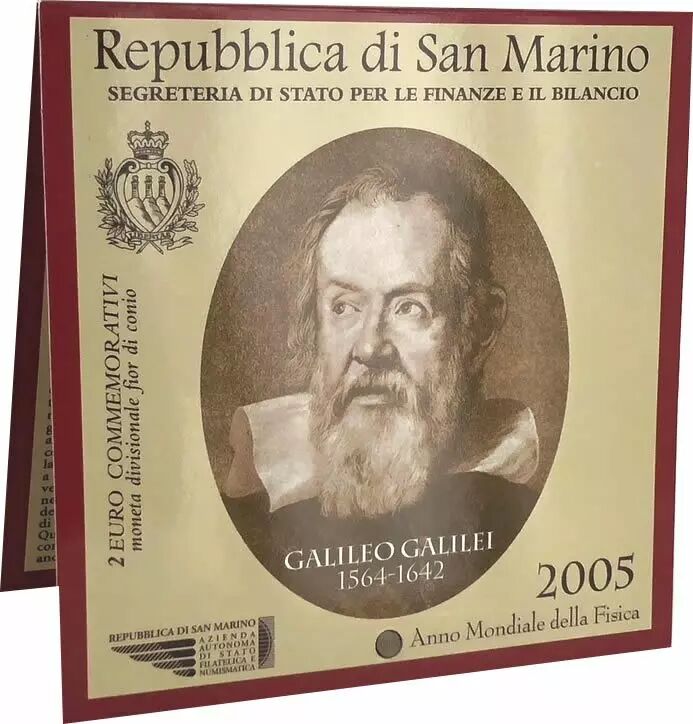 The obverse of the coin features, in its central part, a representation of Galileo, the famous physicist, in front of his work table. He is depicted using a telescope. The year "2005" is discreetly integrated into the table. Above the figure of Galileo, we can read the name of the issuing state, "SAN MARINO". Below, the inscription "ANNO MONDIALE DELLA FISICA" recalls the commemorated event. The letter "R", symbol of the Rome mint, and the initials "LDS" of the engraver Luciana De Simoni, are also present on this face. The twelve stars of the European Community are arranged in a circle in the outer ring, separated by a curve evoking the trajectory of a star.