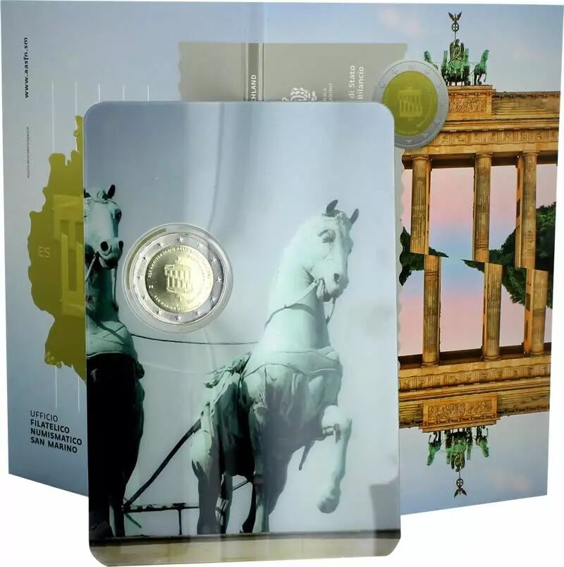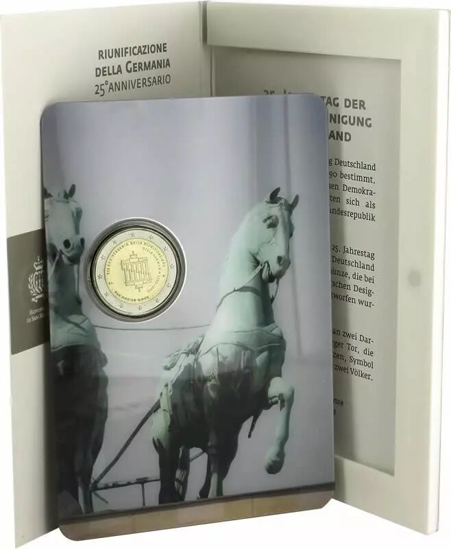 This 2 euro commemorative coin, issued by San Marino in 2015, celebrates the 25th anniversary of German reunification, a historic event that occurred in 1990.