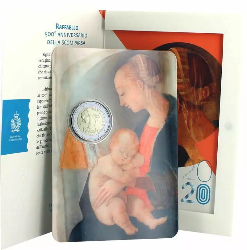 The central part of the coin features a commemorative motif related to Raphael, while the outer ring displays the twelve stars symbolizing the European Union. The issuing country, San Marino, is also identifiable on the coin, as well as the year of issue, 2020.