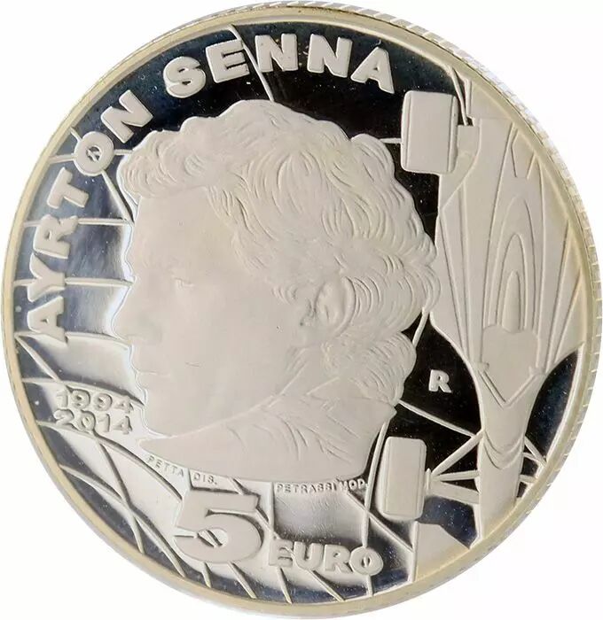 1 May 1994 14:17. During the San Marino Formula 1 Grand Prix, on the Imola circuit, Ayrton Senna starts the 7th lap in first position. Suddenly, the steering column of his Williams FW16 gave way and the car crashed into the Tamburello bend at 240 kph. At 6.40pm, Ayrton Senna died in Bologna hospital. He was 34 years old (born in 1960). 161 Grands Prix, 41 wins, 65 pole positions, 19 fastest race laps and 610 points. Three times world champion in 1988, 1990 and 1991. Considered one of the greatest Formula 1 drivers of all time, twenty years after his death he continues to generate applause and enthusiasm around his name. A silver piece was designed by Marco Petta and modelled by Silvia Petrassi. The face of the champion and his Williams FW16 single-seater are the subjects depicted; the legends ‘1994’, ‘2014’, ‘AYRTON SENNA’, the value ‘5 EURO’ and the symbol R of the Italian Mint complete the design.