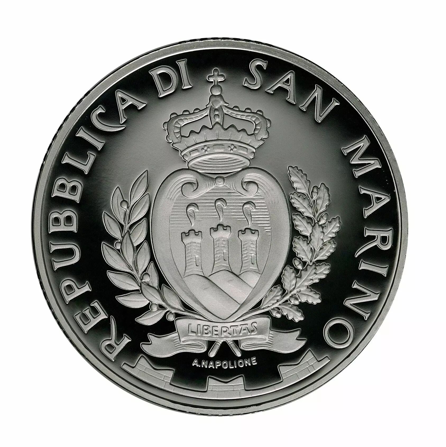 The obverse features the official coat of arms of the Republic of San Marino.