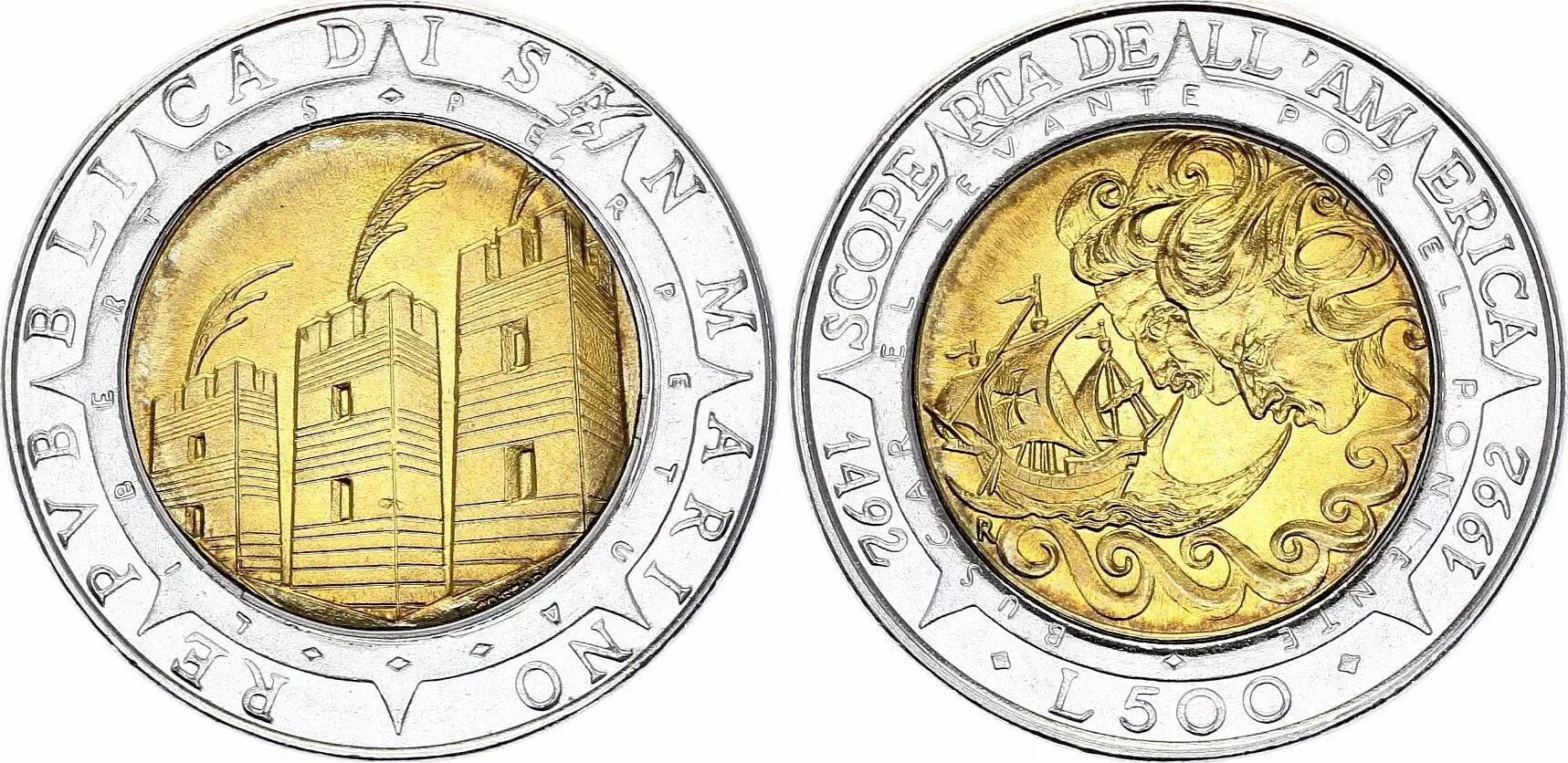Representing the voyage of C. Colombus, a ship, a 15th century caravel, pushed by the wind blown by two curly-haired faces on a rough sea. In a toothed wreath, the first legend, then the second around it, with the date of the voyage and the value.