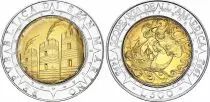 San Marino's 3 towers with their weather vanes. In a toothed crown, the state motto, around its name.