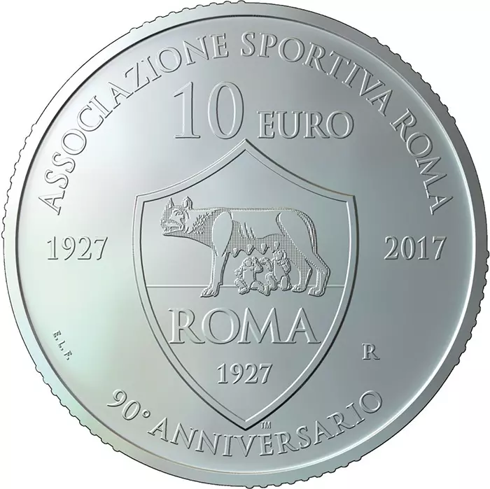 The Associazione Sportiva Roma was born on June 7, 1927 from the merger of three clubs in the Capitoline: Alba-Audace, FootBall Club di Roma and Fortitudo-Pro Roma. Founded with the mission of defending the name, colors and symbol of the Eternal City, AS Roma has retained over time the identity traits present in the vision of the founding fathers, resulting from the beginning in the authentic sporting event of the city of Rome. The reverse of the coin depicts the official emblem of the AS Roma club.