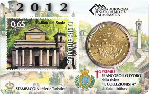 This coincard (85.55 mm x 54 mm) emblematically combines the stamp celebrating the architectural beauties of San Marino (by the author Antonio Giuffrida), winner of the 57th edition of the philatelic competition organised by the magazine ?Il Collezionista?, with the 50 cent coin from the 2012 Brilliant Uncirculated divisional series, by the designer Frantisek Chochola.