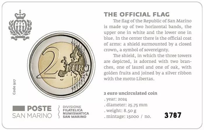 The San Marino 2 euro 2024 coincard features the flag of the Republic, composed of two horizontal stripes, the upper one in white and the lower one in blue. In the centre is the official coat of arms, a shield surmounted by a closed crown, a symbol of sovereignty. The three towers are represented inside the shield, adorned with a laurel branch and an oak branch, with golden fruit and linked by a silver ribbon bearing the motto Libertas.