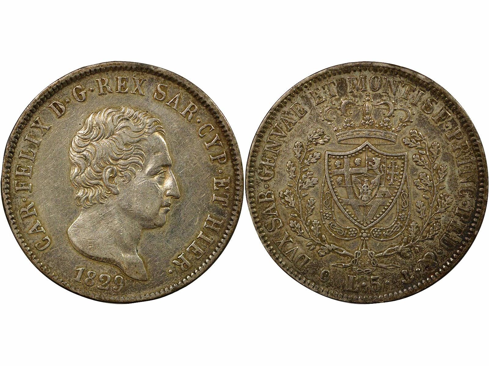 Pièce Sardaigne Charles-Felix - 5 Lire Argent - 1829 P Gênes