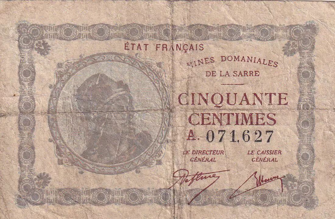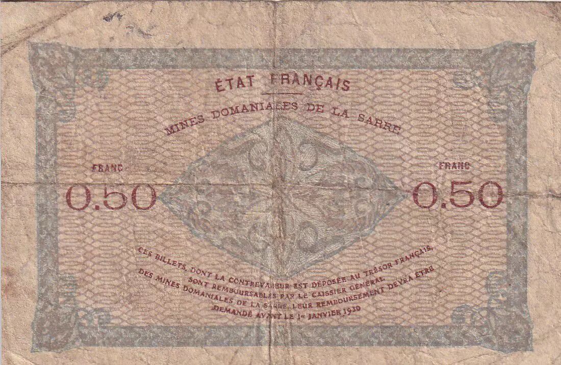 Accueil > Archivage > Sarre 50 Centimes - Mines Domaniales de la Sarre - Type 1920 - Série A - VF.50.01