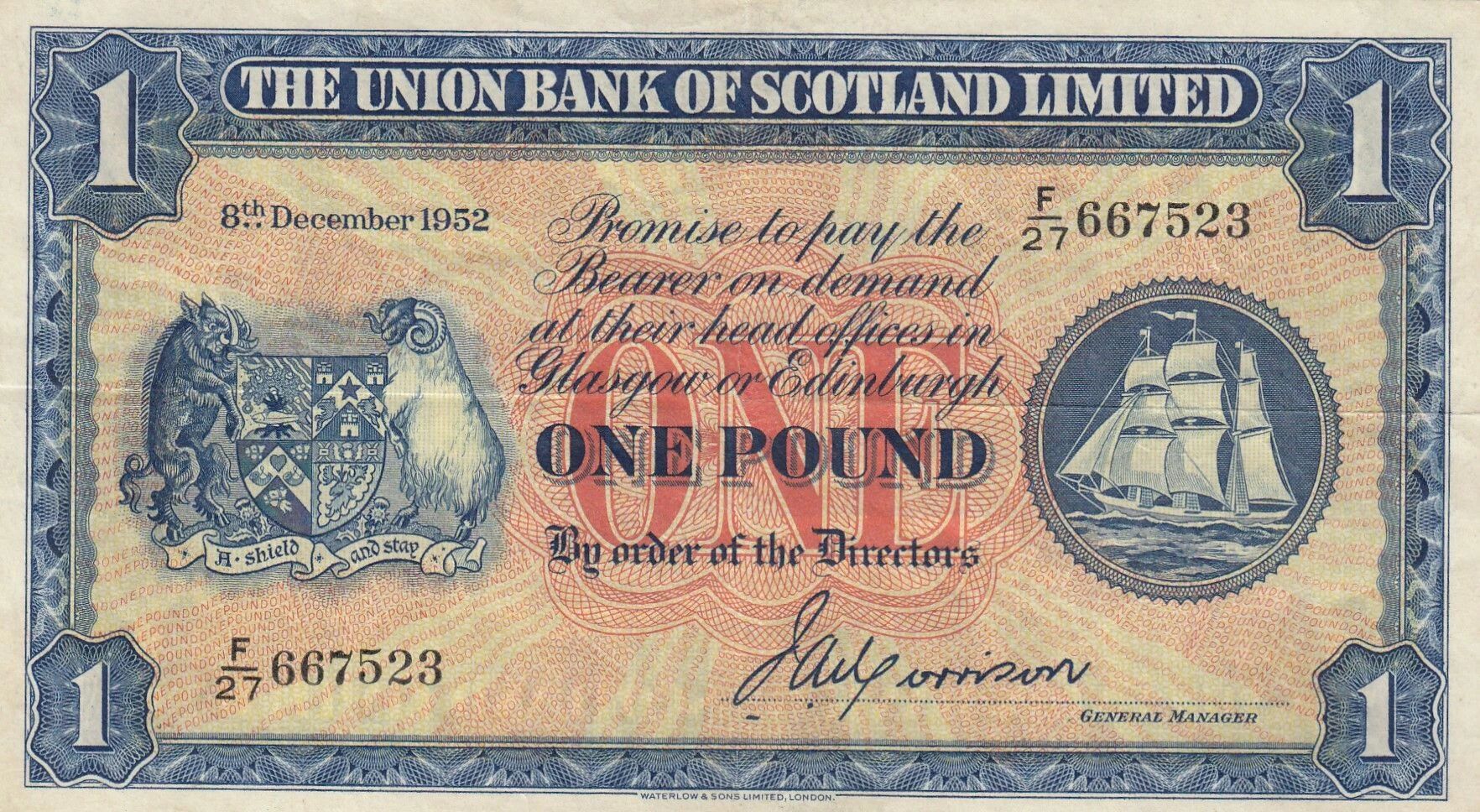 This one-pound sterling banknote, issued in Scotland, dates from December 8, 1952, and belongs to the F/27 series. It is a commemorative banknote featuring coats of arms and shipyard scenes.