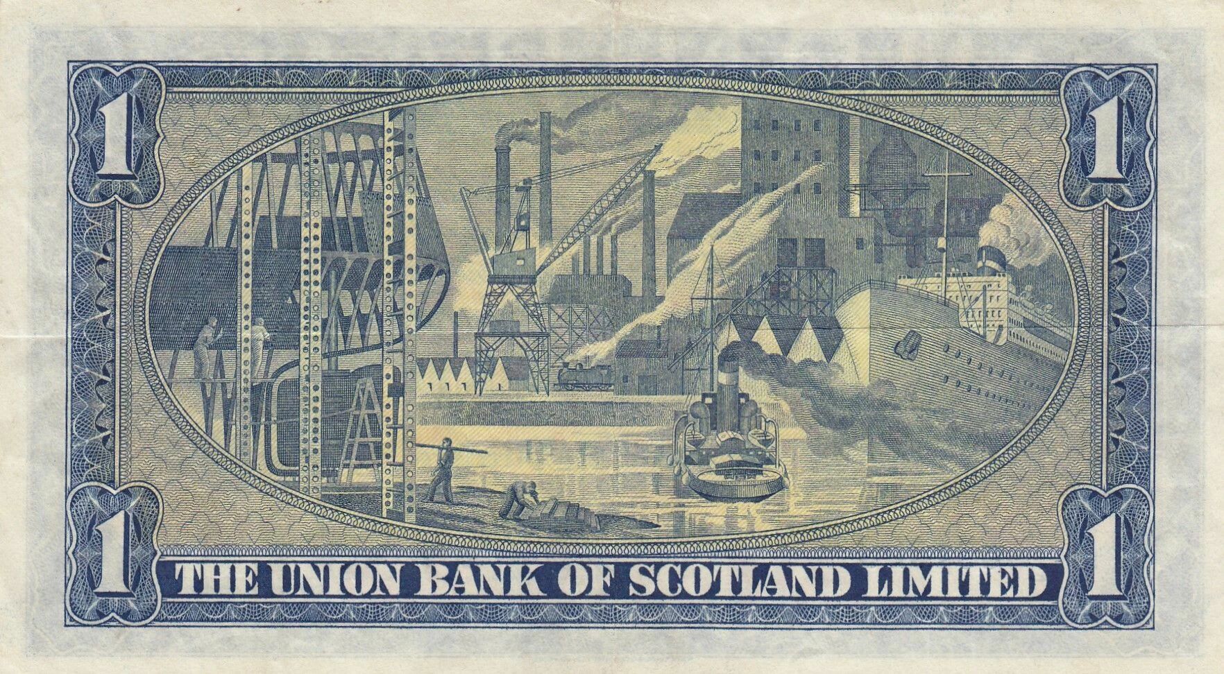 The back of the banknote depicts a lively shipyard scene. It shows workers working on the construction of a ship, with cranes and scaffolding in the background. This scene illustrates the importance of the shipbuilding industry in Scotland at that time. The face value of the banknote, "One Pound", is indicated in words and numbers in several places on the banknote. The name of the issuing institution is also present, although not specified in the data provided.
