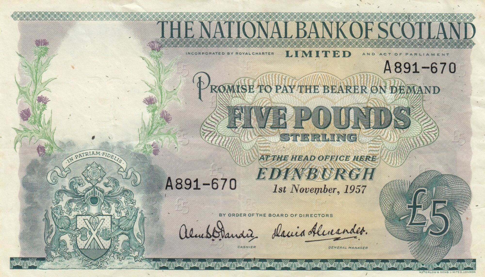 This banknote is issued by Scotland and has a face value of five pounds sterling. The issue date of this banknote is November 1, 1957. It belongs to series A.