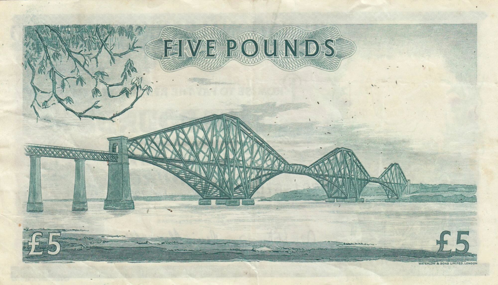 Another distinctive element of this banknote is the depiction of the Forth Bridge. This railway cantilever bridge, located in Scotland, crosses the Firth of Forth. Its construction began in 1882 and was completed in 1890. The Forth Bridge is a symbol of Victorian engineering and an iconic element of the Scottish landscape.