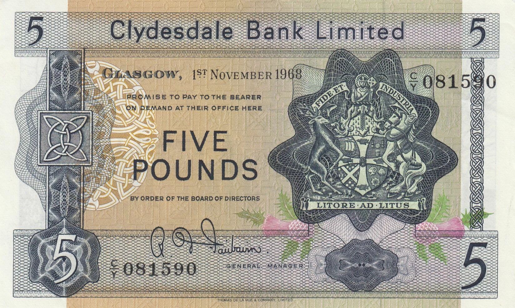 This 5-pound banknote was issued in Scotland on November 1, 1968. It belongs to the C/Y series.