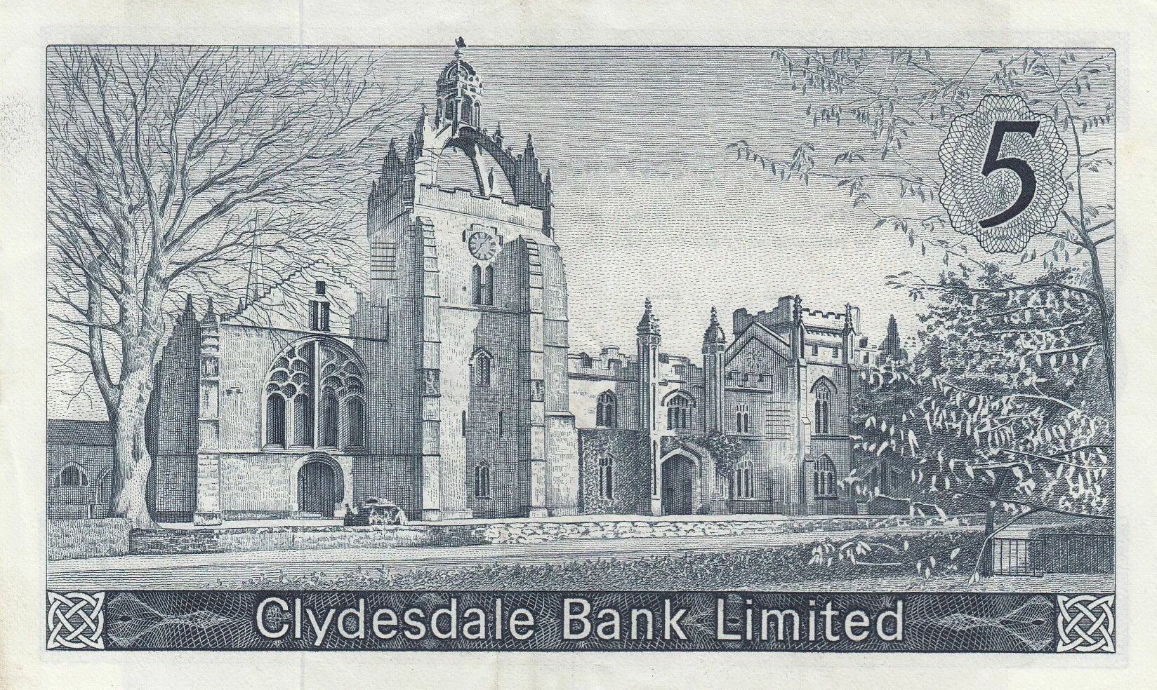 On the back, the banknote depicts a view of King's College in Aberdeen. The main building, with its distinctive architecture, is highlighted. The surrounding landscape is sketched in such a way as to place the college in its geographical context. The face value, "5", is repeated in numerals in the upper and lower corners, while the mention "Five Pounds" also appears in words.