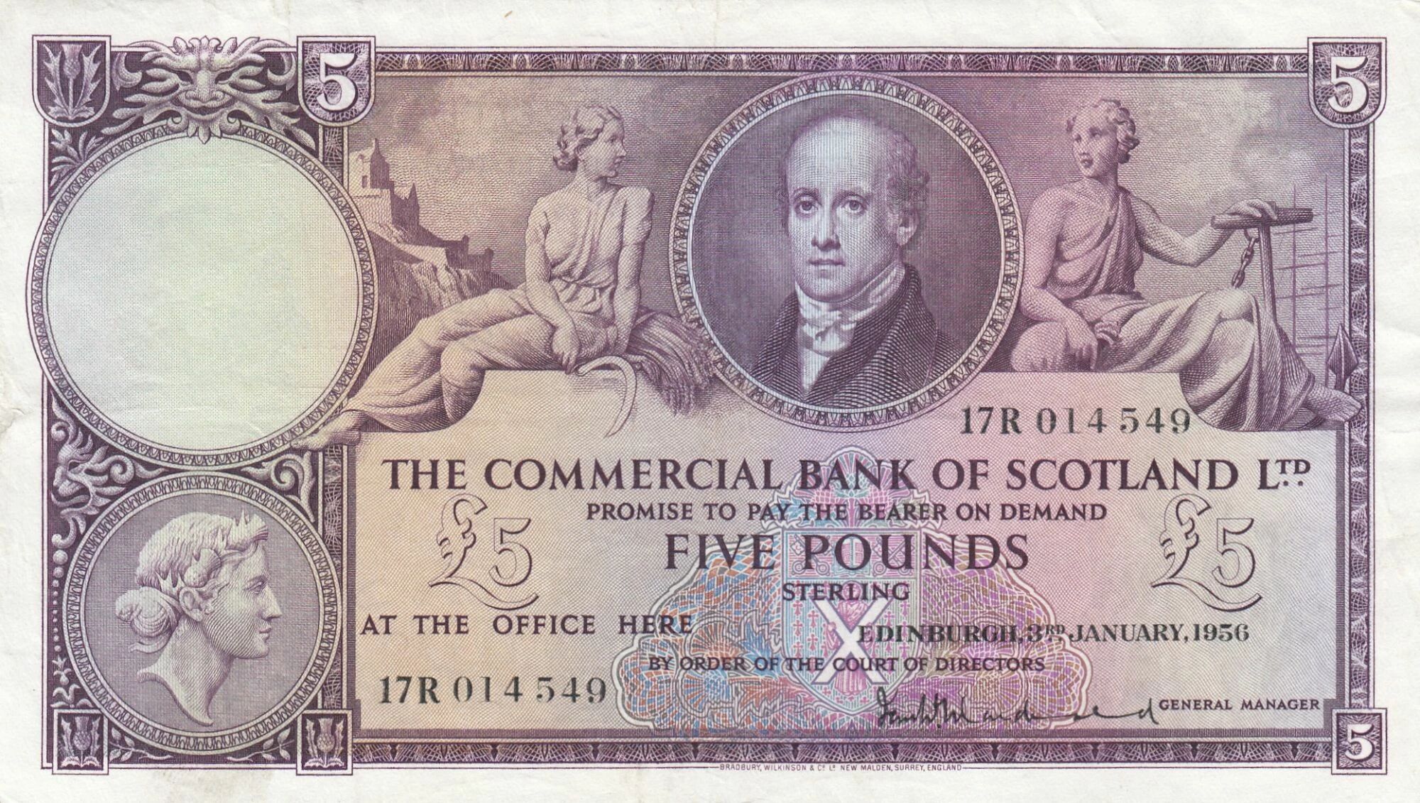 This banknote is issued by the Commercial Bank of Scotland and has a face value of 5 pounds sterling. It is dated January 3, 1956 and belongs to the 17R series.