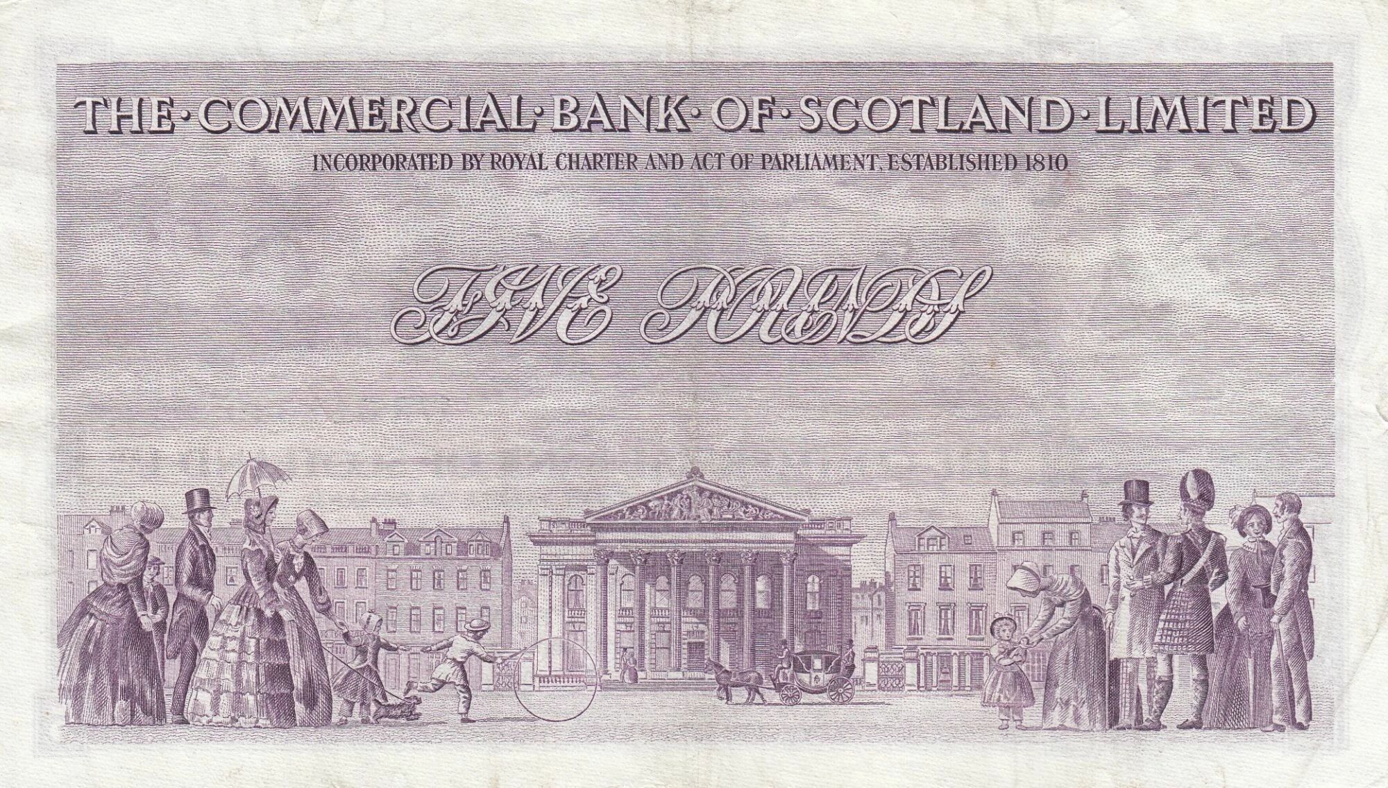 The reverse of the banknote features motifs and illustrations that may include Scottish symbols, coats of arms, or historical scenes. The face value is repeated on the reverse, ensuring easy identification. Additional graphic elements and security features are integrated to prevent counterfeiting. The overall design of the reverse is consistent with the general style of the banknote, reflecting the visual identity of the Commercial Bank of Scotland and the era of its issuance.