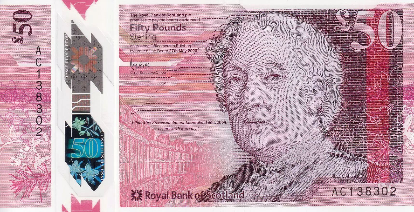 Banknote Scotland 50 Pounds - Flora Stevenson - Birds, fish - Polymer - 2020 - UNC - P.NEW