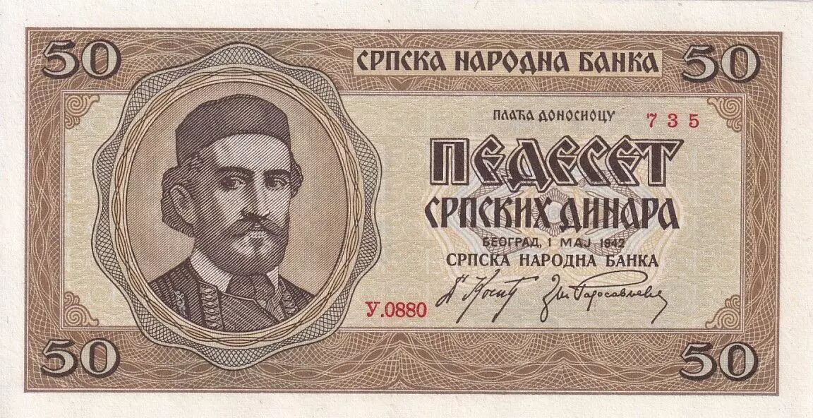 This banknote is an issue from Serbia dating back to 1942, with a face value of 50 dinars. It belongs to the Y.0880 series.