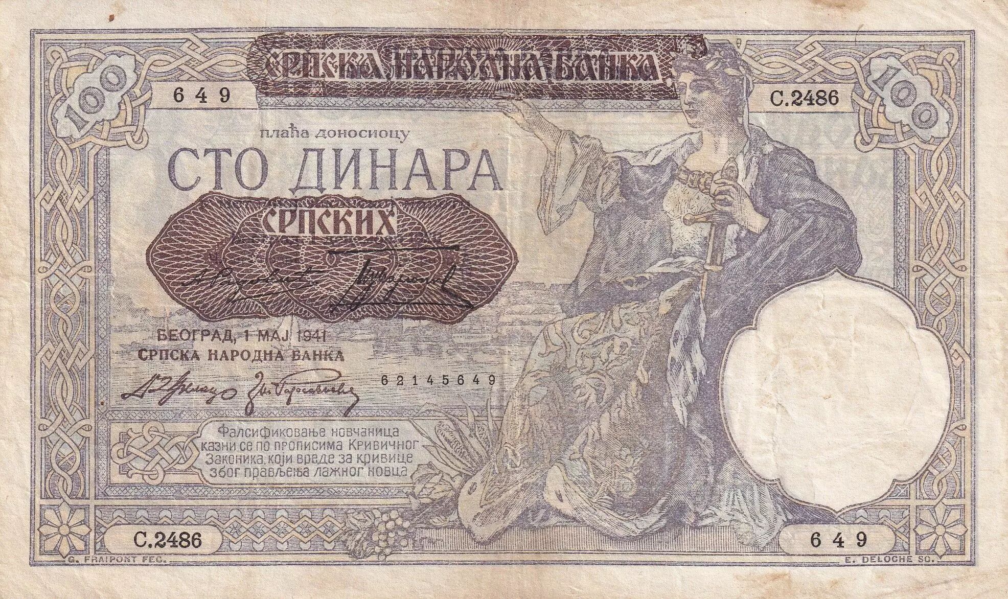 Accueil > Archivage > Serbie 100 Dinara - Femme assise - Paysan - 1941 - Série C.2486 - P.23