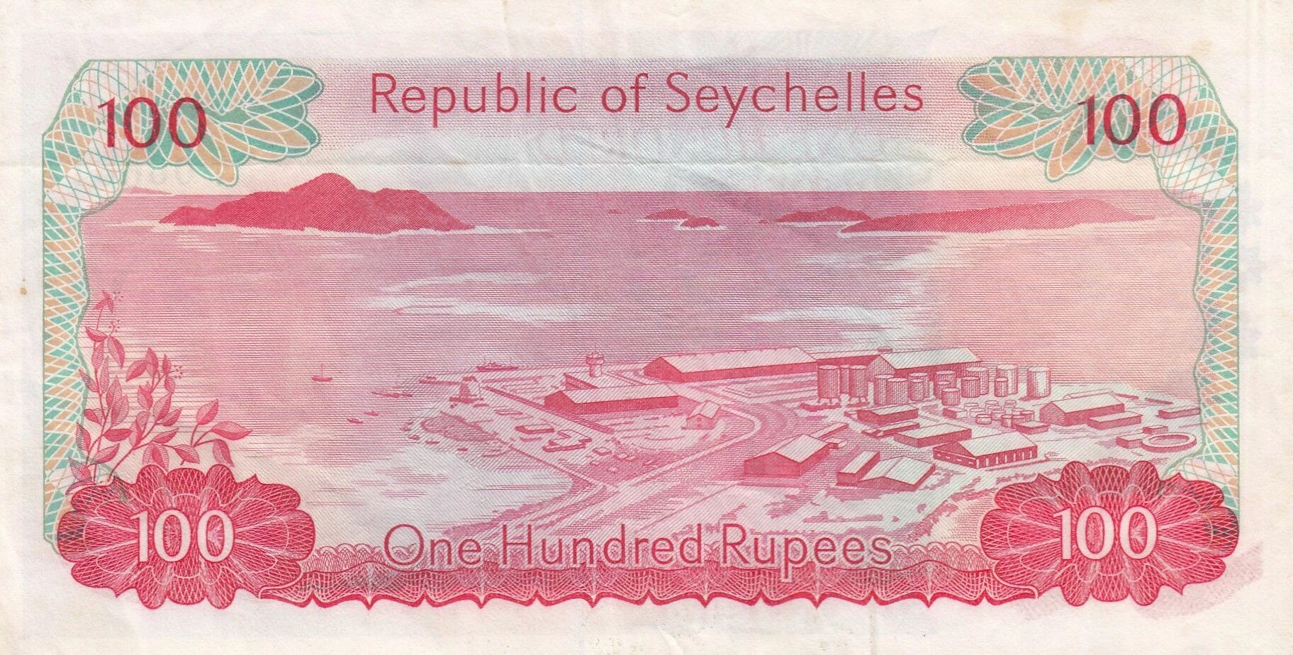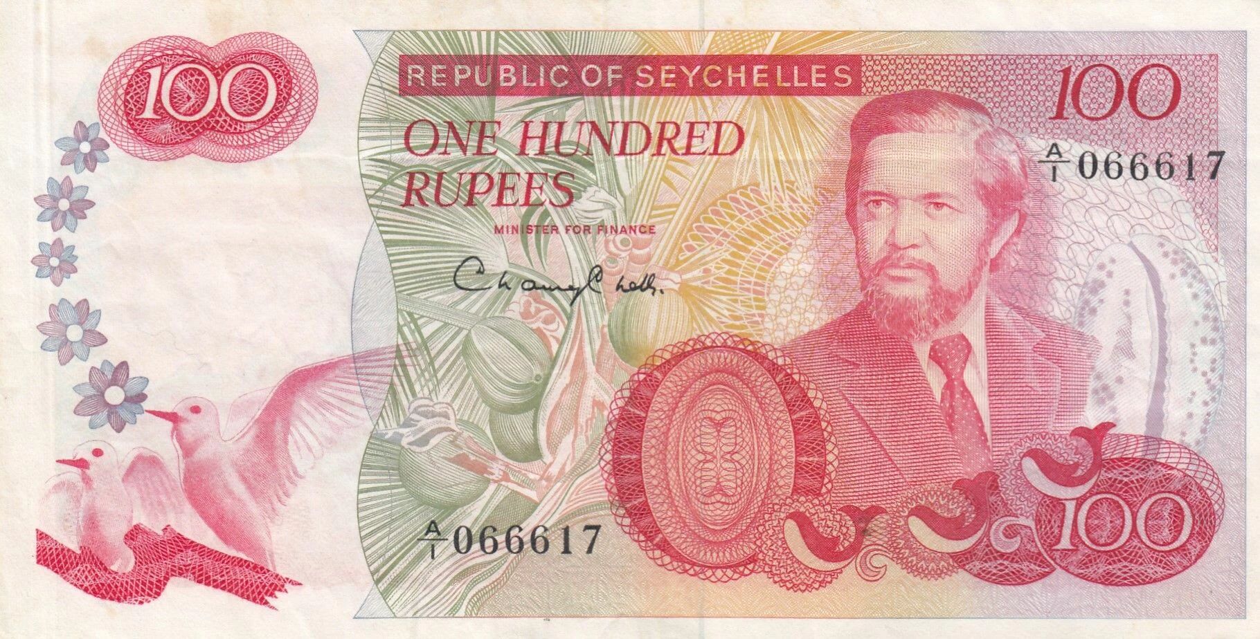Ce billet de banque des Seychelles, d'une valeur nominale de 100 rupees, a été émis en 1977. Il fait partie de la série A/I.