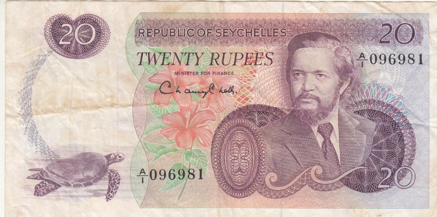 Ce billet de banque est une émission de 1977 des Seychelles, d'une valeur nominale de 20 Rupees. Il appartient à la Série A/I.