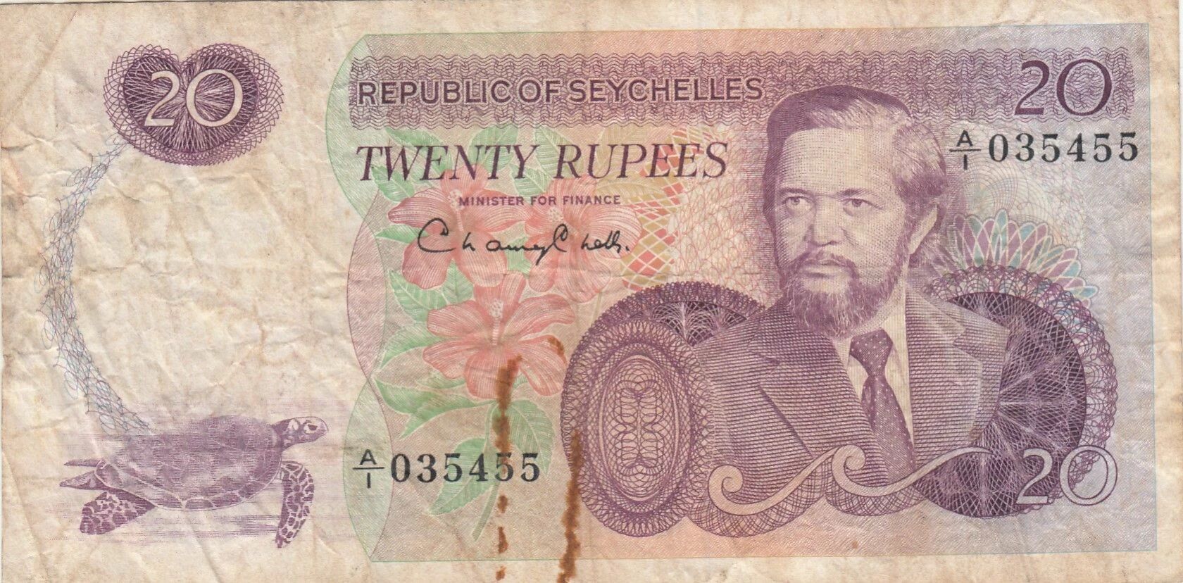 Ce billet de 20 rupees commémore la présidence de Monsieur Mancham. Les billets de banque sont des instruments fiduciaires émis par une institution financière, servant de moyen de paiement dans les transactions économiques d'un pays.
